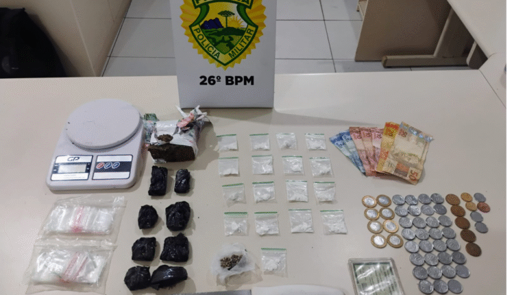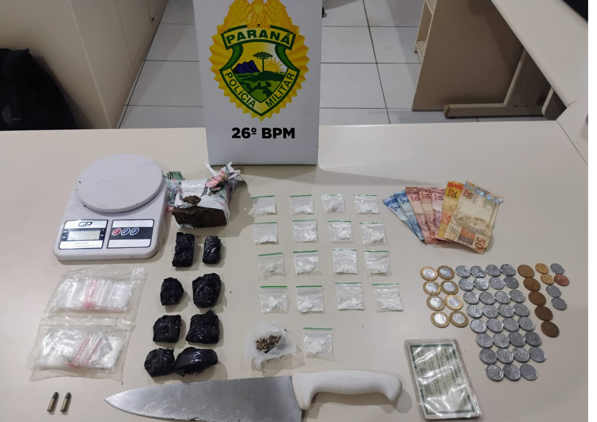 Diante da situação, a equipe realizou a abordagem no imóvel, onde foram localizadas diversas porções de maconha e cocaína já fracionadas para comercialização, além de uma balança de precisão, embalagens utilizadas para o acondicionamento das drogas, dinheiro em espécie e munições.