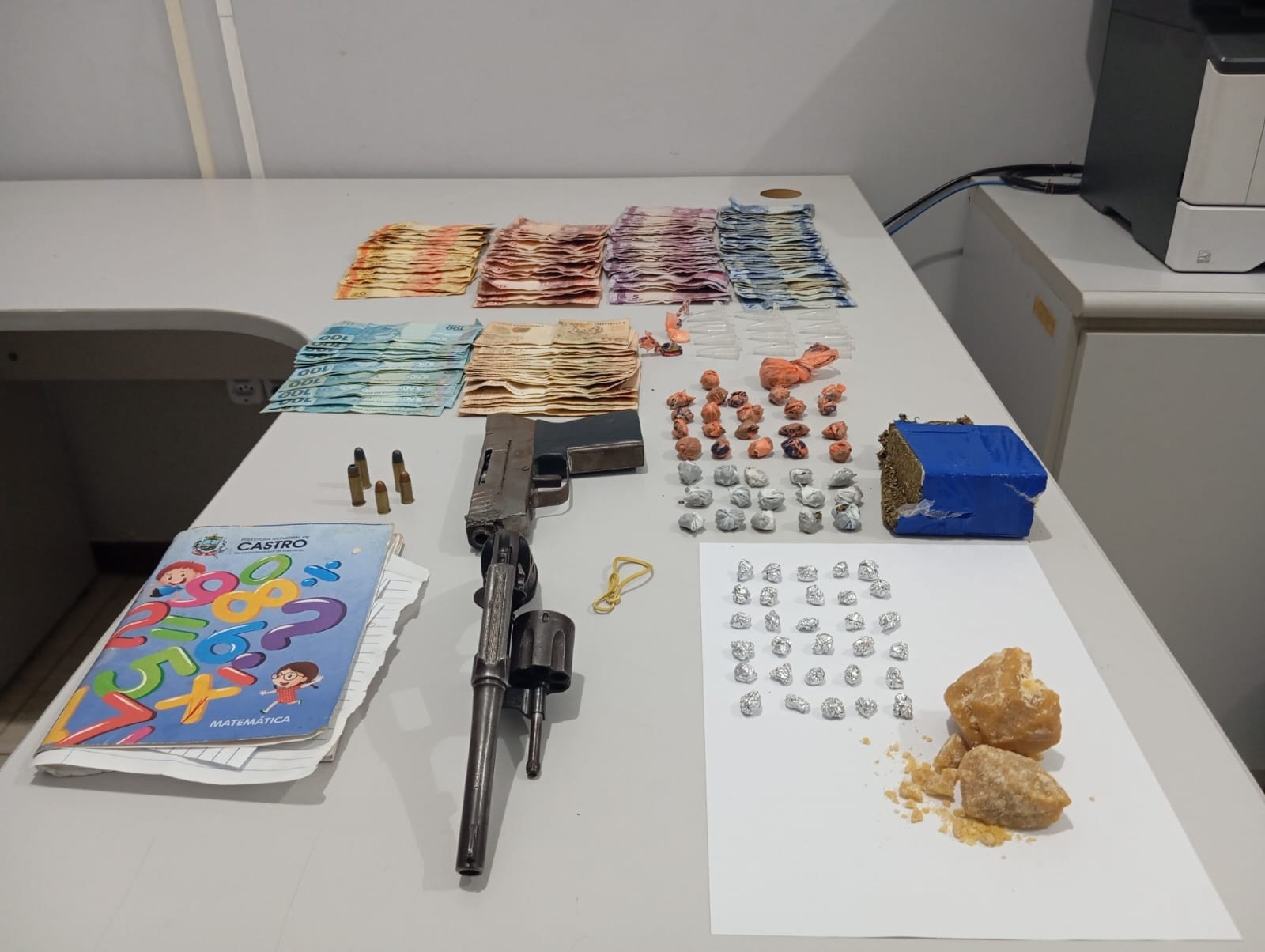 Segundo a PM, o suspeito foi abordado e, durante a busca pessoal, os policiais encontraram pedras de substância análoga ao crack. A equipe deu continuidade às diligências em uma residência relacionada à ocorrência, onde foram localizados mais entorpecentes e dinheiro. Em seguida, em outro endereço vinculado aos fatos, os policiais encontraram e apreenderam duas armas de fogo.
