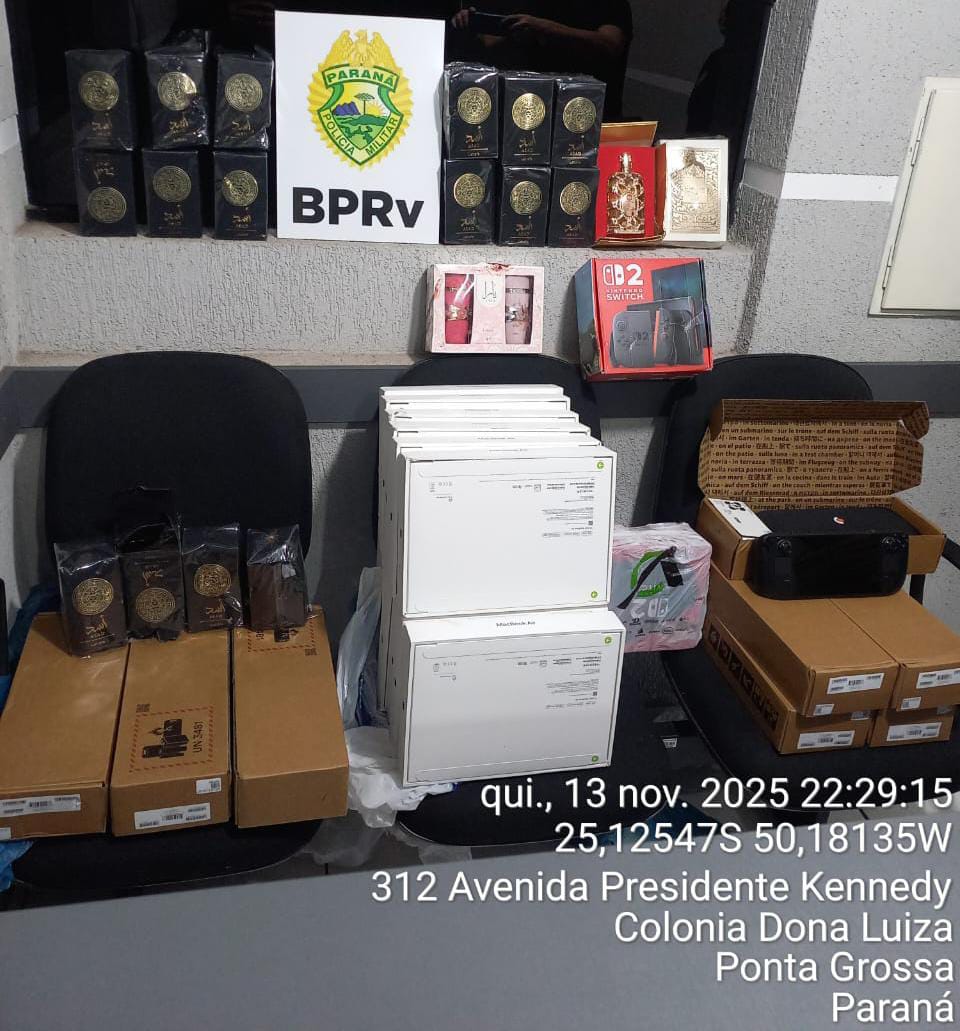 Entre os itens apreendidos estavam 10 frascos de perfume Asad/Lattafa, 1 perfume Fakhar/Lattafa, 1 perfume Royal Amber, 1 perfume Yara/Lattafa, além de 2 consoles Nintendo Switch, 8 consoles portáteis marca Valve, 13 MacBook Air e 9 toalhas de banho de cores variadas.