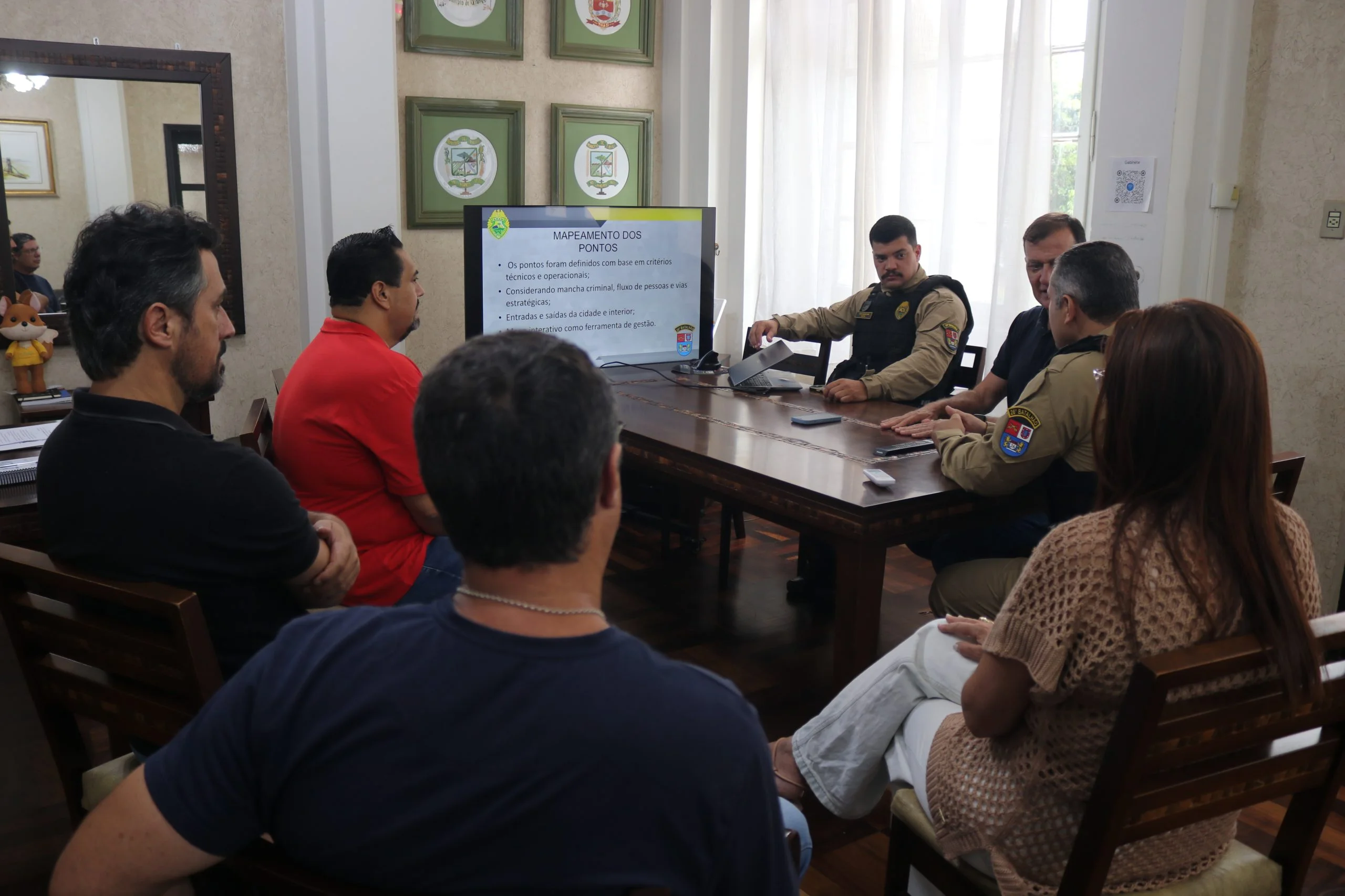 Durante a apresentação, a Polícia Militar compartilhou informações estratégicas sobre o município e apresentou o mapa do sistema de monitoramento, indicando os pontos atualmente atendidos e as áreas com potencial para receber novas câmeras.