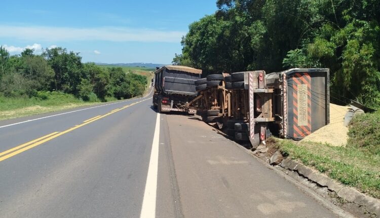 Sengés – Na manhã desta terça-feira (27), por volta das 11h15, acidente do tipo tombamento ocorreu no km 199+300 metros da PR-151, no trecho entre Sengés e Jaguariaíva. A situação envolveu um tritrem, com quatro compostos, sendo caminhão Volvo FH 540 e três unidades da marca Randon.