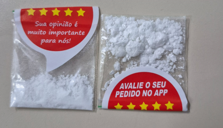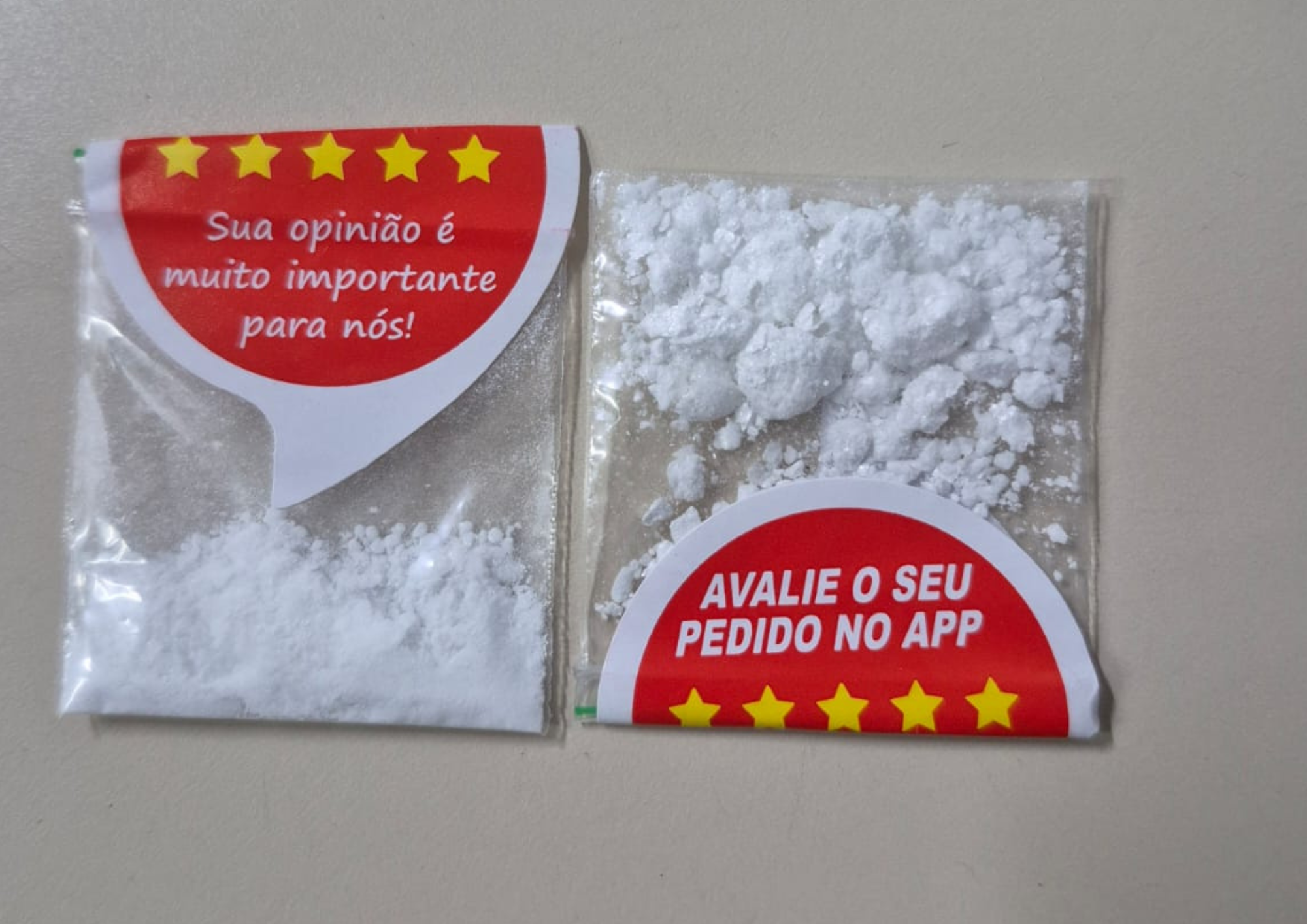 Outro detalhe que chamou a atenção dos agentes foi a presença de etiquetas nos invólucros, com uma mensagem solicitando a avaliação do produto, que deveria ser enviada por meio do aplicativo.