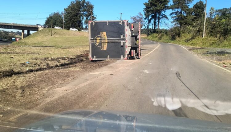 Ponta Grossa – Tombamento de caminhão foi registrado na manhã desta quinta-feira (18), no viaduto da Santa Terezinha, que liga a cidade de Ponta Grossa à BR-376. O caminhão, que pertence a um frigorífico da cidade, tombou por motivo ainda desconhecido, quando estava na alça de acesso no sentido bairro.