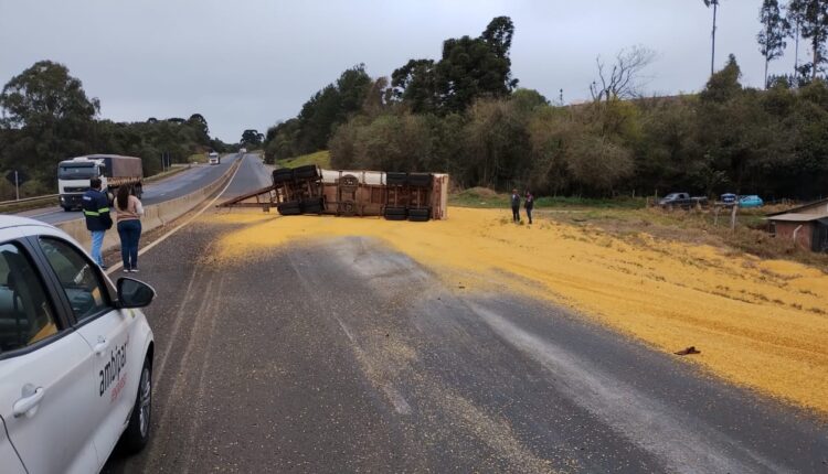 Piraí do Sul – Acidente envolvendo o tombamento do segundo reboque de um caminhão carregado com milho bloqueou completamente a PR-151, no km 252, sentido Ponta Grossa, na tarde desta segunda-feira (16). A situação ocorreu por volta das 16h, e equipes da concessionária EPR Litoral Pioneiro foram acionadas para atender a ocorrência.