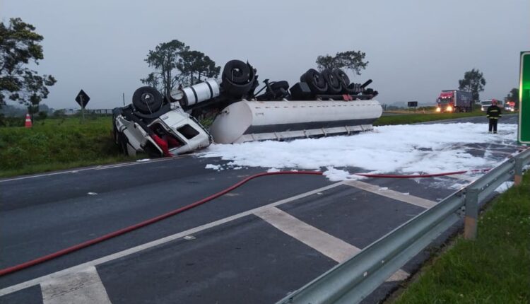 Carambeí – A PR-151 está totalmente interditada nos dois sentidos no km 306,411, em Carambeí, na manhã desta quinta-feira (2), para trabalhos de limpeza da pista após o tombamento de um caminhão-tanque.