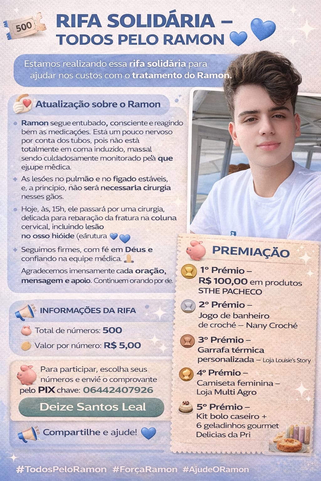 O quadro clínico do adolescente é considerado grave. “Desde o acidente, encontra-se internado em estado grave. Ele sofreu lesão no fígado e no pulmão, inicialmente sem necessidade de intervenção cirúrgica, mas permanece sob acompanhamento médico rigoroso”, explicou a mãe. Ramom também apresenta múltiplas fraturas na face, ao todo oito, que exigirão procedimento cirúrgico, além de lesão na coluna cervical. “Ele está em uso de colar cervical, segue entubado, sedado e internado em unidade hospitalar, recebendo medicação com corticoide para redução do edema facial, a fim de possibilitar a realização da cirurgia”, detalhou.