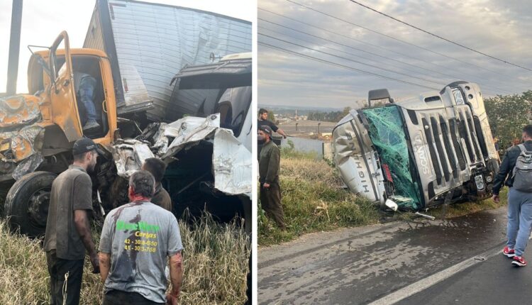 Um terceiro caminhão, que seguia no sentido sul, foi atingido durante a manobra descontrolada. O motorista perdeu o controle, o veículo desceu de ré, tombou e caiu em uma trincheira.