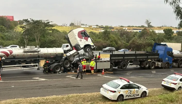 Nas imagens que circulam em redes sociais é possível ver o caminhoneiro Aureliano Antonio Messias, de 58 anos, fechando os olhos e perdendo o controle no momento em que a carreta avança e prensa o carro contra outro veículo. O advogado, que estava sozinho, morreu no local.