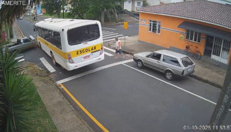 VÍDEO – Colisão entre ônibus escolar e caminhonete é registrada em cruzamento de Carambeí
