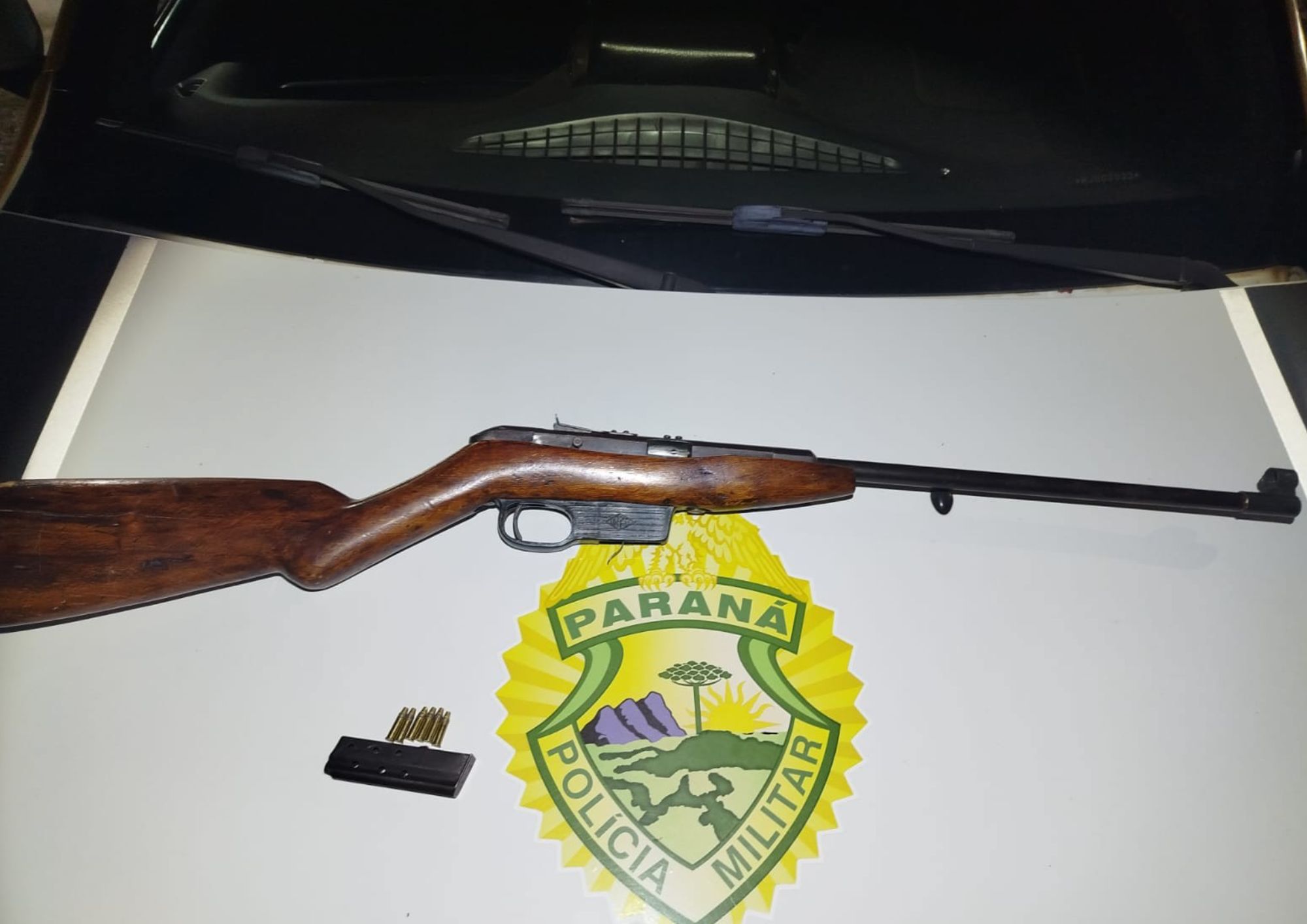 Durante diligências na residência, a Polícia Militar localizou um rifle calibre .22, municiado com seis cartuchos intactos, que, segundo a corporação, estava pronto para uso. A arma foi apreendida.