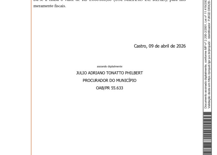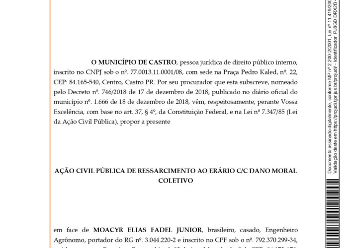 Castro – A Procuradoria Geral do Município de Castro, através do procurador Julio Adriano Tonatto Philbert, protocolou na quinta-feira (9) junto ao Juízo da Vara da Fazenda Pública da Comarca de Castro, Ação Civil Pública de Ressarcimento ao Erário Publico com Dano Moral Coletivo contra o deputado estadual e ex-prefeito de Castro, Moacyr Elias Fadel Junior, a qual pede ressarcimento por supostos prejuízos ao dinheiro público e indenização por dano moral coletivo. O valor inicial da causa foi fixado em R$ 1 milhão.