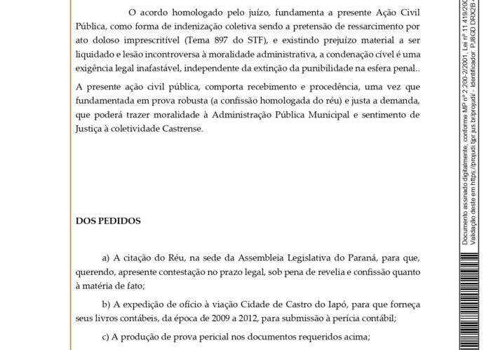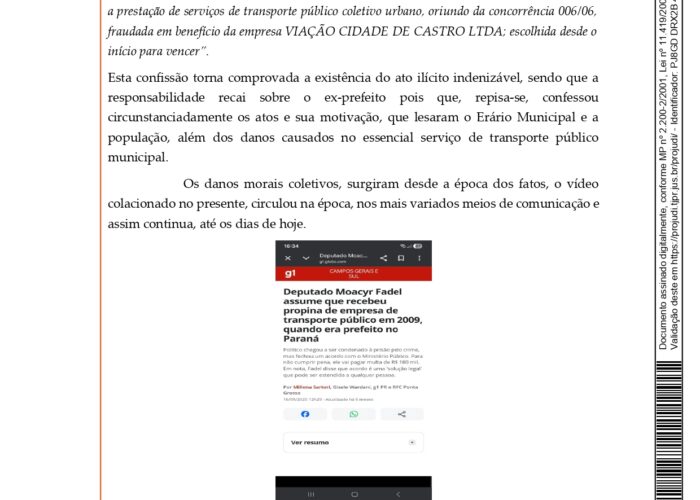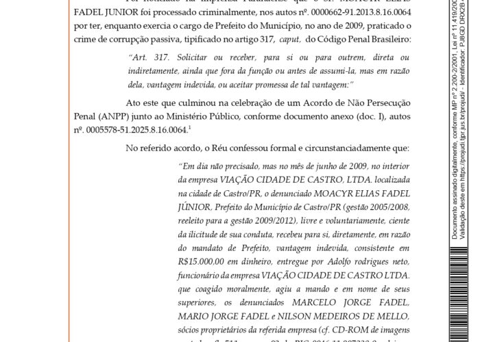 A ação foi ajuizada com base na confissão apresentada por Moacyr Fadel em Acordo de Não Persecução Penal (ANPP), firmado na esfera criminal. Segundo a Procuradoria, no acordo ele admitiu ter recebido R$ 15 mil em propina em 2009, quando era prefeito, em um caso ligado à manutenção do contrato do transporte coletivo urbano de Castro.