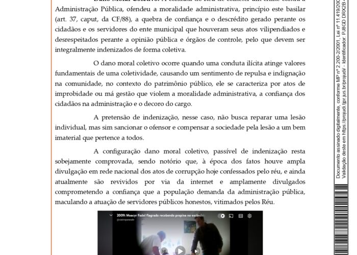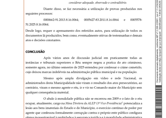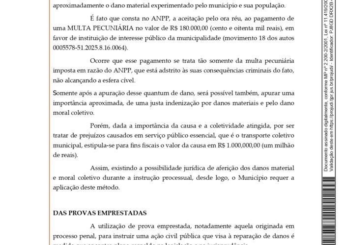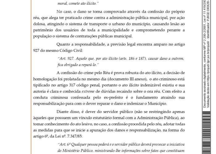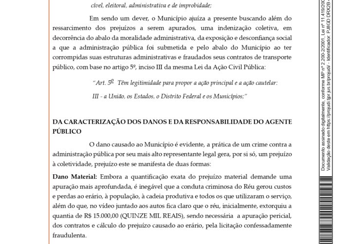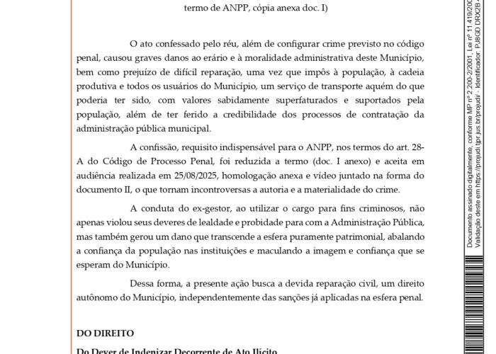 De acordo com a petição apresentada à Justiça, a confissão aponta que a vantagem indevida teria sido recebida em troca da manutenção irregular do contrato de concessão do transporte público, o que, na avaliação do Município, causou prejuízos ao sistema de transporte, à lisura do processo licitatório e à confiança da população na administração pública.