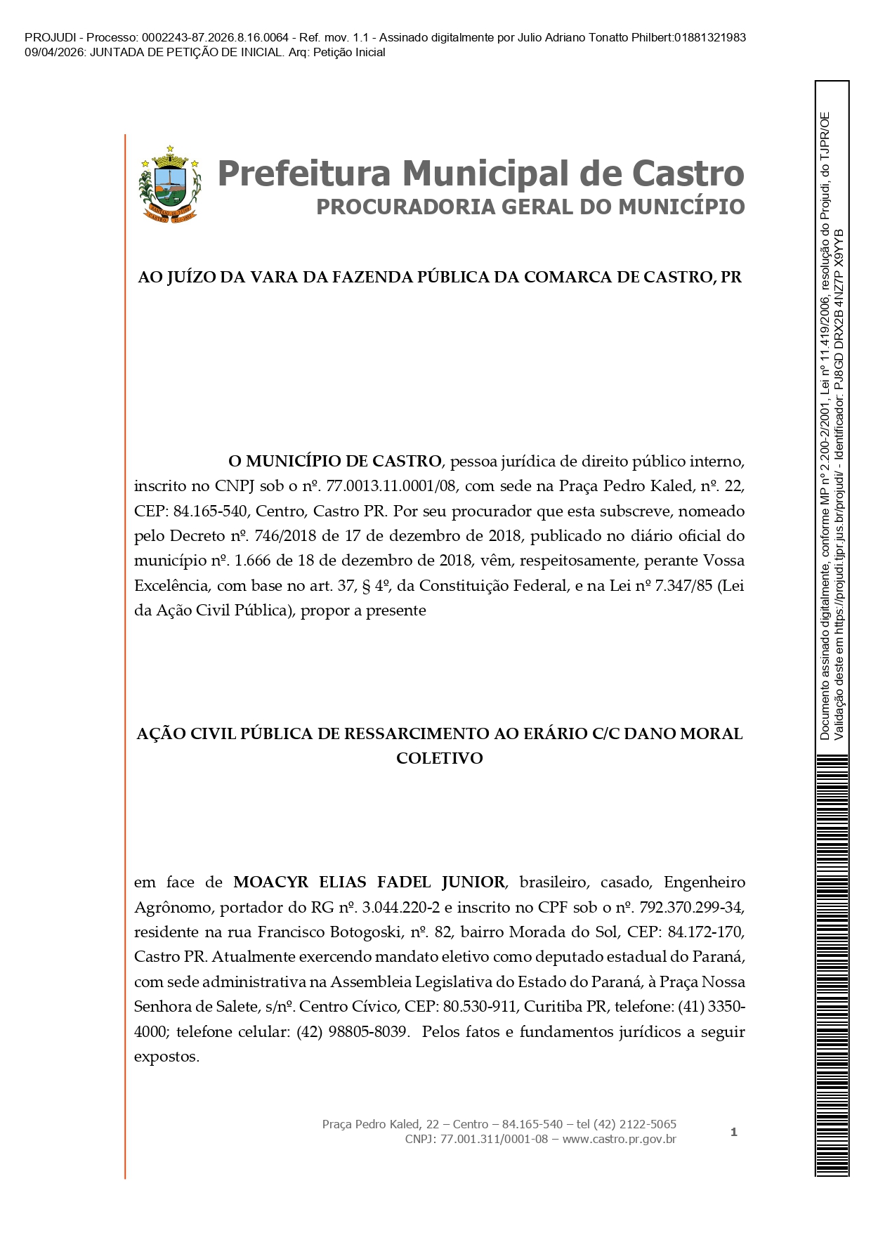 • Procuradoria Geral do Município de Castro move ação contra Moacyr Fadel e pede indenização de R$ 1 milhão