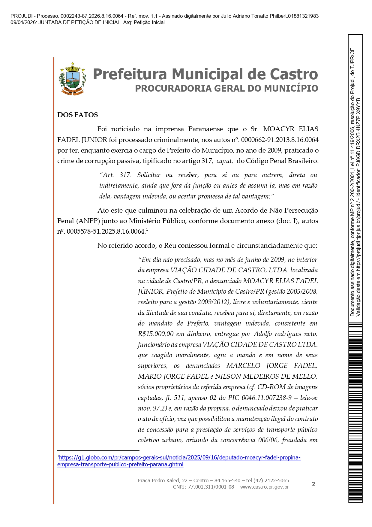 Voltar para "Procuradoria Geral do Município de Castro move ação contra Moacyr Fadel e pede indenização de R$ 1…" ACAOINDENIZATORIAANPP_page-0002 Próximo Anterior