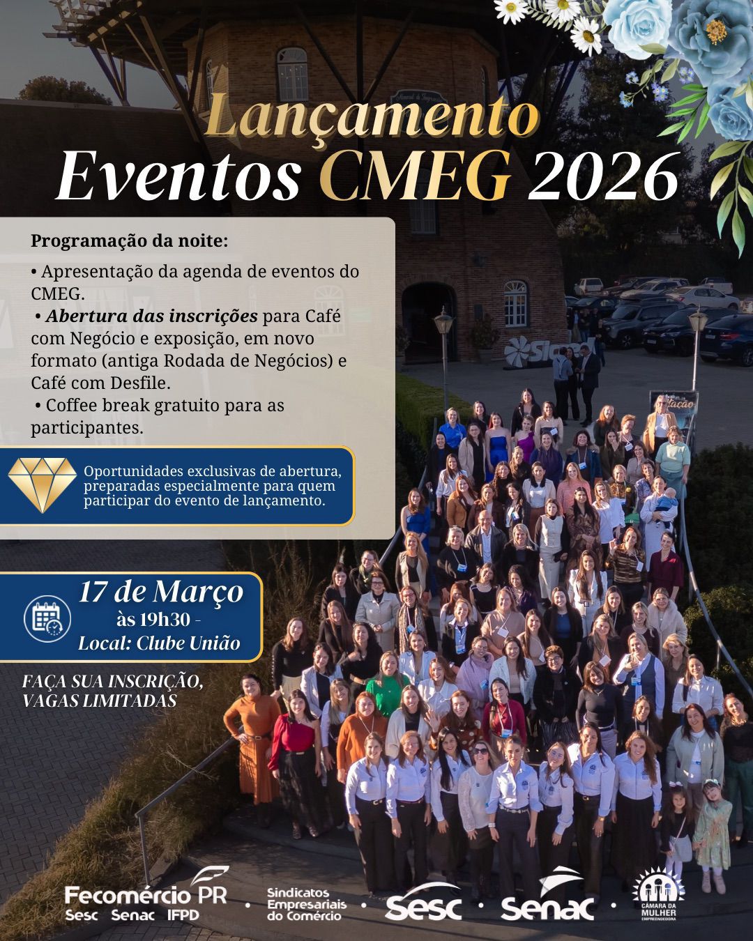 Castro – A Câmara da Mulher Empreendedora e Gestora de Negócios de Castro (CMEG) realiza nesta terça-feira (17), às 19h30, no Clube União, o lançamento oficial do calendário de ações para 2026. O evento reúne mulheres empreendedoras do município e região para a apresentação do planejamento anual da entidade.