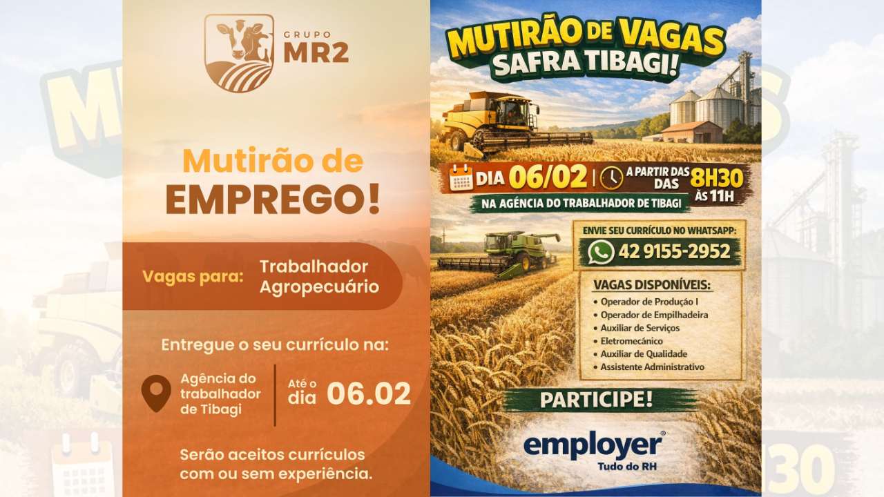 Já o segundo mutirão é voltado para vagas de safra e acontece no dia 06 de fevereiro, na Agência do Trabalhador de Tibagi, das 8h30 às 11h.