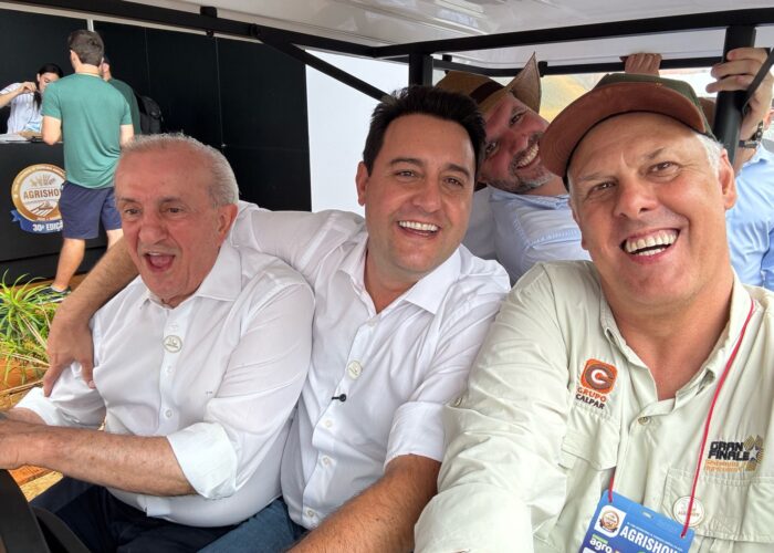 Feira não é só trabalho, tem também diversão, nem que seja em um carrinho de golfe. Pois esse foi o transporte utilizado pelo governador do Paraná, Carlos Massa Ratinho Junior; diretor comercial do grupo Calpar, Paulo Bertolini; deputado federal Pedro Lupion (PP-PR), e Francisco Maturro, ex-secretário da Agricultura do Estado de São Paulo, até o estande da Calpar / Granfinale. O registro aconteceu na manhã desta segunda-feira (28), no primeiro dia de uma das maiores feiras agrícolas no mundo e a maior feira agropecuária do Brasil, a Agrishow 2025. São mais de 800 marcas expositoras em 520.000 m² de área. Está explicado o porque do carrinho!
